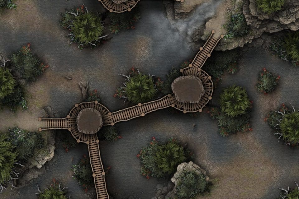 Click image to download a free TTRPG battlemap of these Trackless Fens Treetop Bridges, then keep scrolling for the detailed adventure prompt written for it.