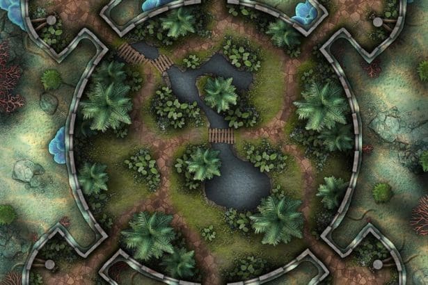 Click image to download this free TTRPG battlemap of Blossoming Ruins, then keep scrolling for the detailed adventure prompt written for it.