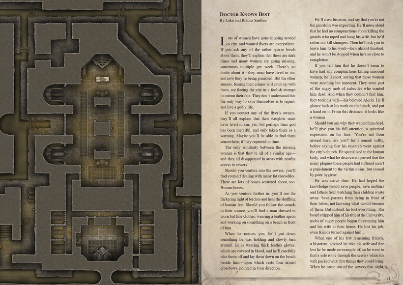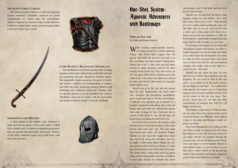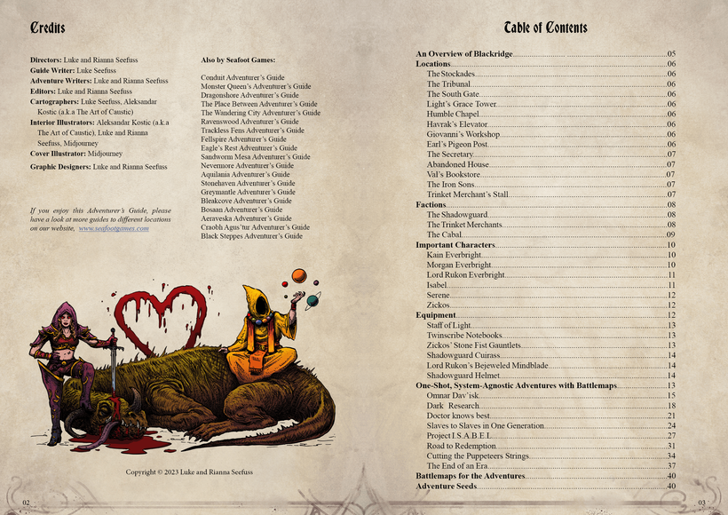 This illustrated, 40 page Adventurer’s Guide contains 7 battlemaps with system-agnostic adventures written just for them, a map of the city of Blackridge, locations, a list of factions, important NPCs (portraits included), more adventure seeds, plus 6 illustrated digital item cards with loot your players can find!