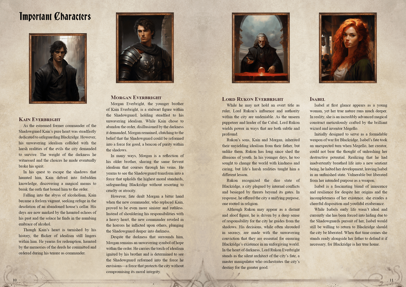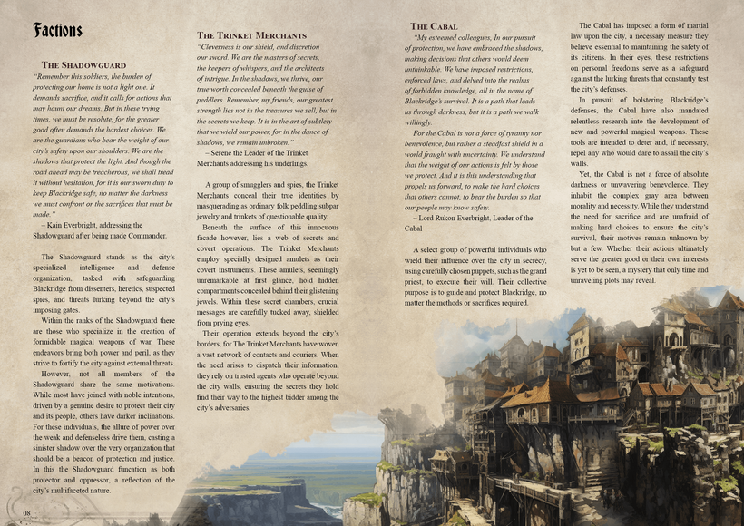 Blackridge’s history is one of power, fear, and an ever-increasing authoritarian grip. Over the decades, the Cabal has become deeply entrenched in their belief of an impending cataclysm, constantly expecting devastating attacks from neighboring kingdoms. Wielding their influence like a shadowy puppeteer, they control the city through the help of the elite Shadowguard and a grand priest who dances to their tune, enacting their will through divine decree.