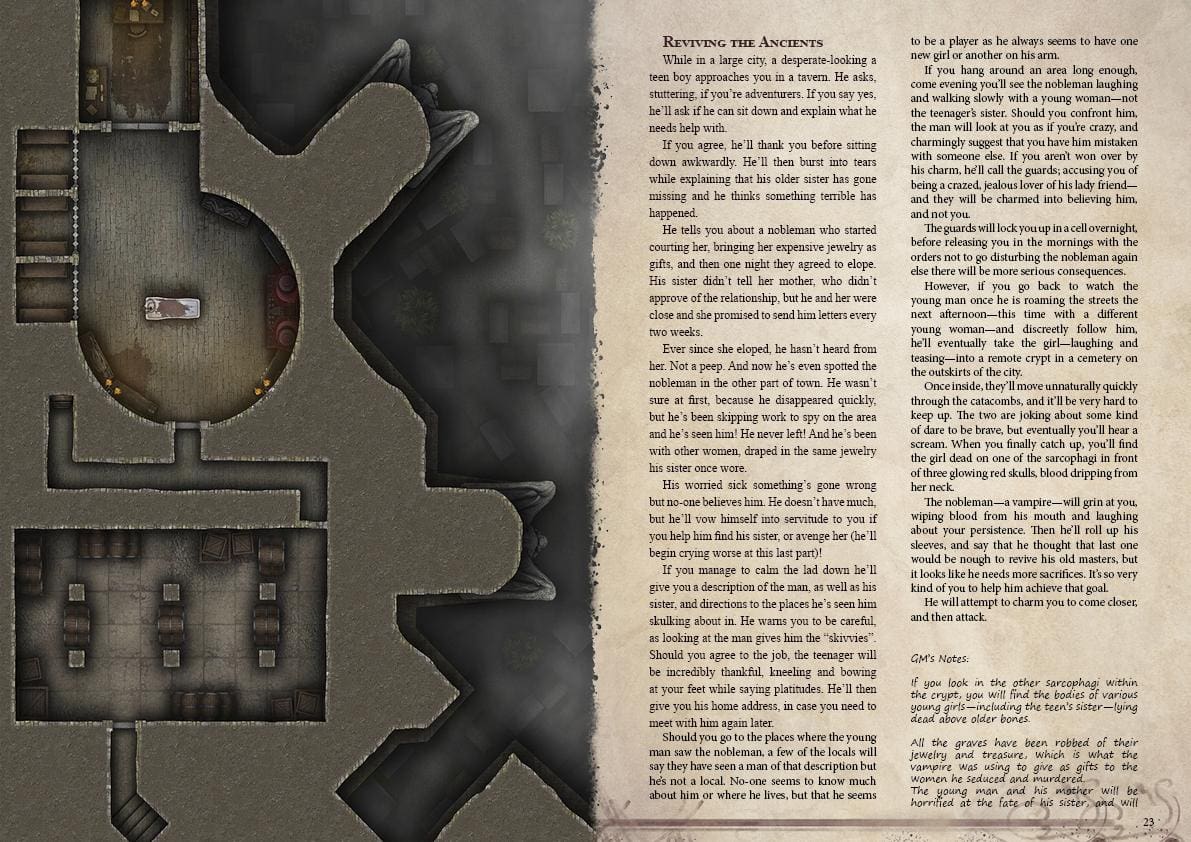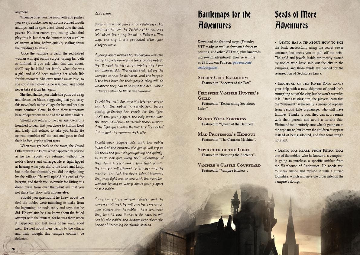 The first place they infiltrated and destroyed was the only threat to them; the vampire hunters guild. Now, the vampires stand unchallenged to enact their diabolical plans. Will your players step up and become the vampire slayers this city needs, saving it before it falls to darkness again? Or will they side with the vampires, choosing instead power and eternal life?