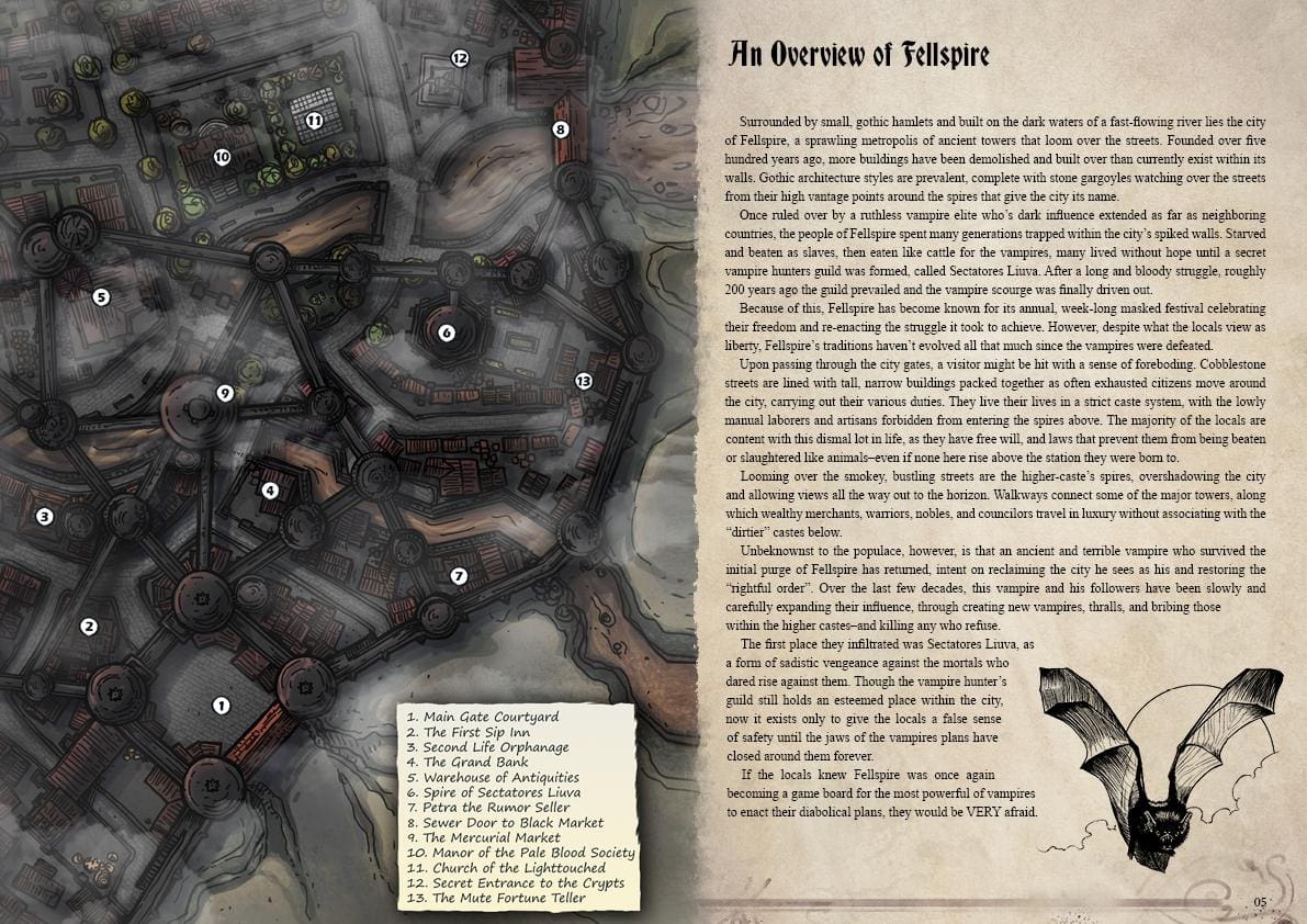 Once ruled over by a ruthless vampire elite, the people of Fellspire spent many generations trapped within the city’s spiked walls. Starved and beaten as slaves, then eaten like cattle for the vampires, many lived without hope until a secret vampire hunters guild was formed. After a long and bloody struggle, roughly 200 years ago the guild prevailed and the vampire scourge was finally driven out.